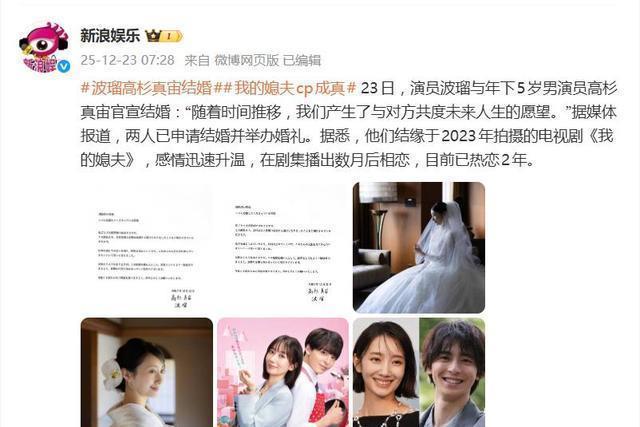 12月23日,演员波瑠与高杉真宙突然官宣结婚的消息,直接让全网CP粉“过大年”。这对在日剧《我的媳夫》里大撒糖分的荧幕情侣,竟真的把剧情照进了现实,被网友惊呼为“最强售后”。 根据双方通过社交平台发布的声明,两人表示“随着时间推移,我们产生了与对方共度未来人生的愿望”。更让剧迷上头的是,现实与剧集设定高度重合:34岁的波瑠比29岁的高杉真宙年长5岁,完美复刻剧中“姐弟恋”主线。据日媒报道,本月初两人已低调提交结婚申请,并举办了一场仅限亲友的私密婚礼,经纪公司更是选在凌晨5点优先通知粉丝,这波操作可谓将低调进行到底。